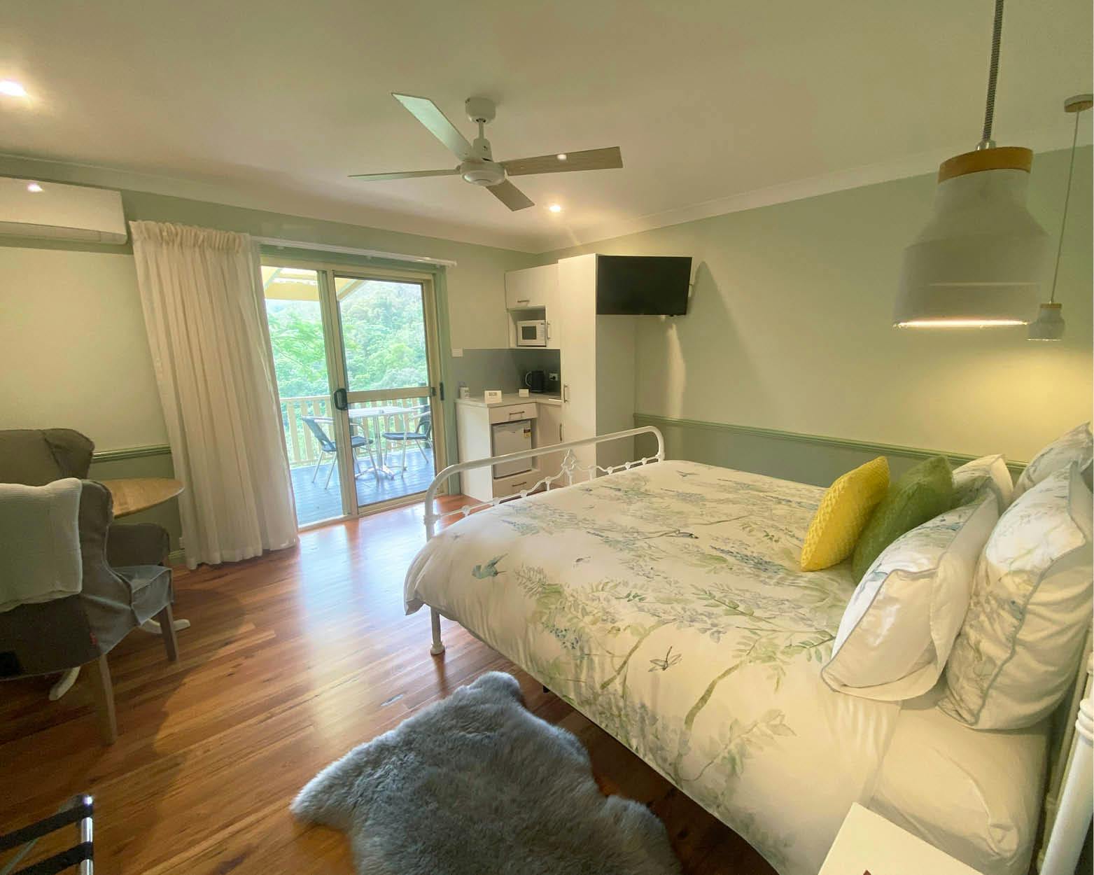 - Bar fridge, microwave, crockery & cutlery